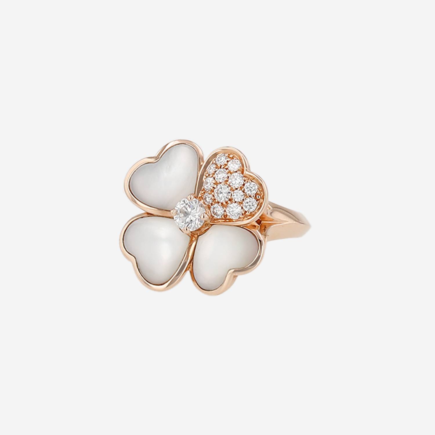 Bague Van Cleef & Arpels Cosmos en or rose, en nacre (Turbo Marmoratus) et en diamants, figurant un ravissant trèfle quadrilobé en or rose partiellement serti de diamants de taille brillant de 0.22 carat environ et de motifs bombés en nacre blanche, ornée en son centre d'un très beau diamant de taille brillant pesant 0.20 carat, réhaussée d'un anneau en or rose.