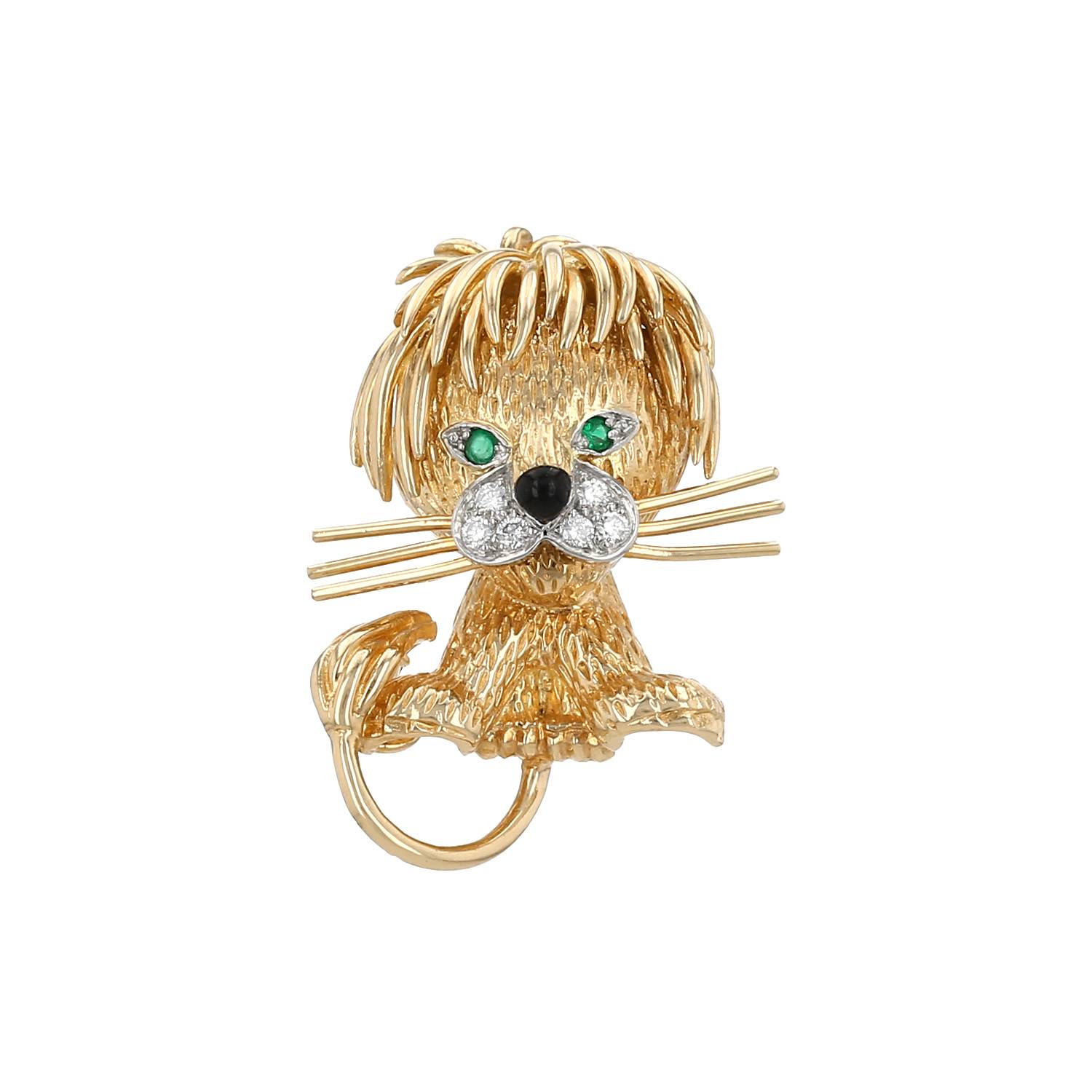 Broche époque années 1970 Van Cleef & Arpels Lion Ebouriffé petit modèle en or jaune, en platine, en diamants et en émeraudes, figurant un indémodable lion en or jaune texturé et en platine, orné de 2 émeraudes de taille brillant et d'une truffe en émail, réhaussé d'un très beau pavage de diamants de taille brillant environ 0.10 carat.