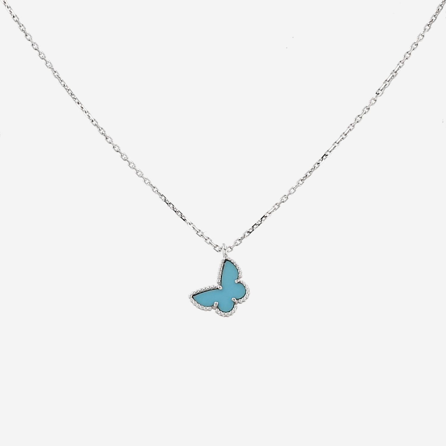 Collier Van Cleef & Arpels Sweet Butterflies en or blanc et turquoise, figurant un ravissant papillon en turquoise, réhaussé d'une délicate bordure perlée en or blanc, retenu par une fine chaine à maillons forçat en or blanc.