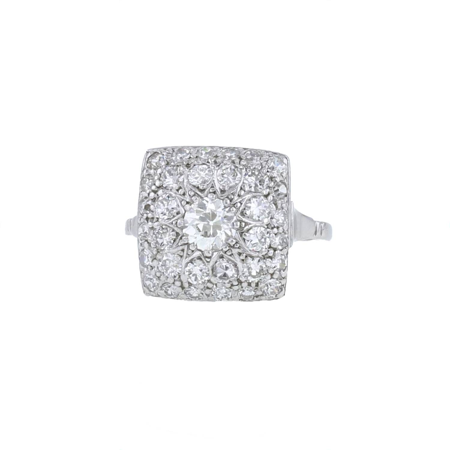 Bague Vintage en platine et diamants, composée d'un beau motif carré bombé élégamment serti de diamants de taille brillant et de taille 8/8 de 0.62 carat environ, ornée au centre d'un diamant de taille brillant ancienne pesant environ 0.20 carat, réhaussée d'un fin anneau en platine.