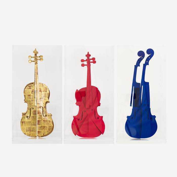 Arman, "Hommage à Yves Klein", triptych of three sculptures, wood, pigments and plexiglass box, signed and numbered, of 1993. Editor : Tête à Tête, Paradise Valley (USA). Maker : Universel Litho, Paris (France). Edition de 99 copies numbered, 14 french artist proofs EA numbered, 14 copies HC numbered and 14 artist proof AP numbered. The edition of this multiple is complete when the three violins are together.