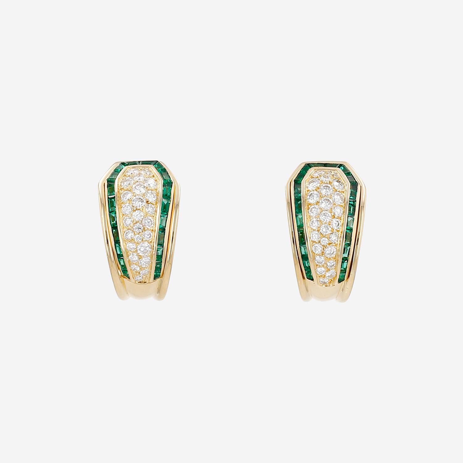 Boucheron earrings for non pierced ears in yellow gold, in diamonds, and in emerald, composed of of geometric patterns in yellow gold, decorated with one pavement brilliant cut in diamonds weighting about 0.62 carat, enhanced of beautiful baguette cut emerald.