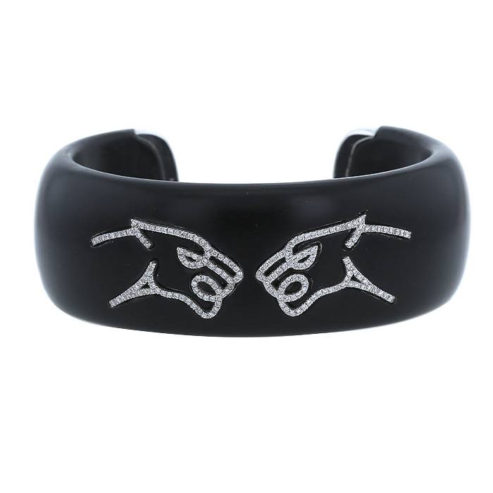 Very beautiful Bulgari Enigma by Gianni Bulgari bracelet in white gold, holz, diamonds, composed of one significant open bangle, decorated with 2 panthers diamonds in its center, enhanced with stripes white gold on the edge.