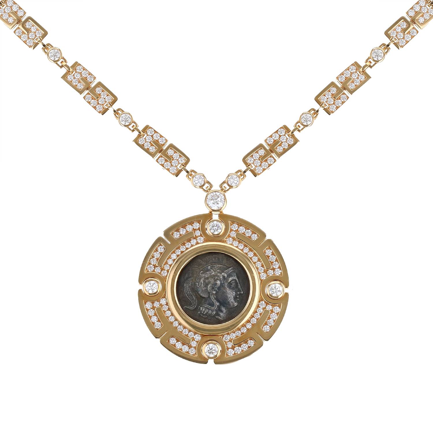 Exceptional and rare Bulgari Monete long necklace in pink gold, in silver, and in diamonds, composed of one important round medallion in pink gold set with one silver coin (didrachm Lucania Velia 400-350 B.C.), decorated with one superb pavement of brilliant cut diamonds on the setting enhanced of half-articulated diamonds close set, enhanced on the chain by an alternating of wonderful geometric links set with brilliant cut diamonds and brilliant cut diamonds close set for a total weight of 17,31 carat.