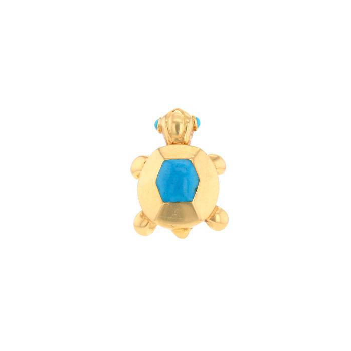Cartier brooch in yellow gold and turquoise, including one lovely turtle in yellow gold, decorated with one cabochon in turquoise, enhanced of small cabochon in turquoise.