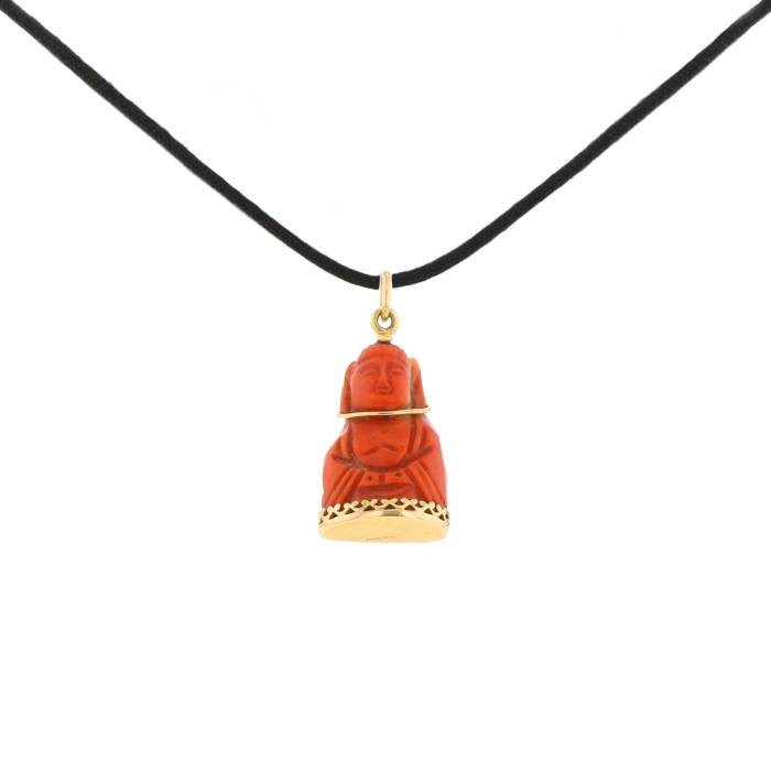 Superb and rare Cartier pendant in yellow gold coral, stylizing a buddha in coral, decorated with one light setting yellow gold.