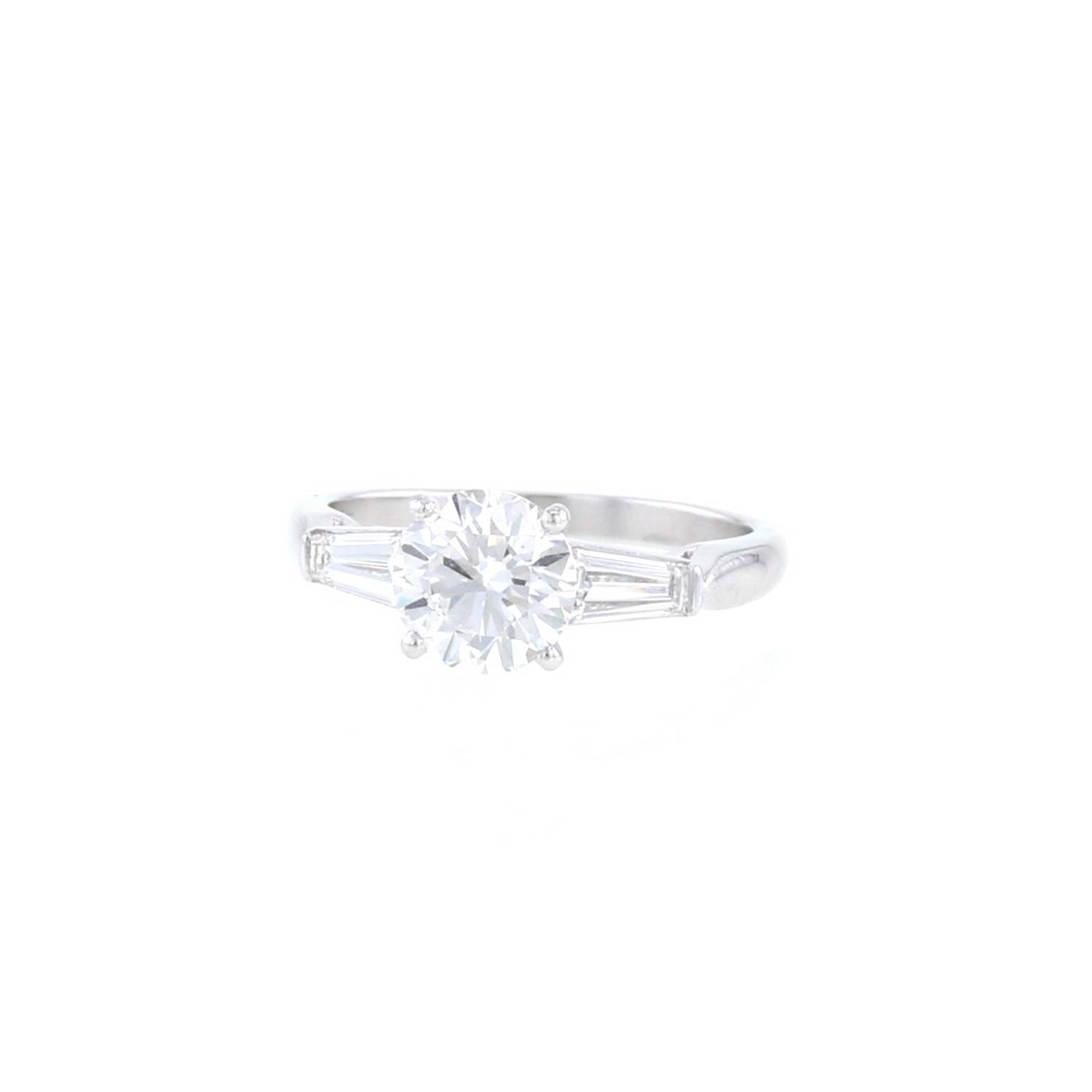 Cartier ring in platinium and diamonds, composed of one setting in platinium, decorated with one splendid brilliant cut diamond weighting a total of 1.53 carat in its center reinforced with 2 tapers diamonds.