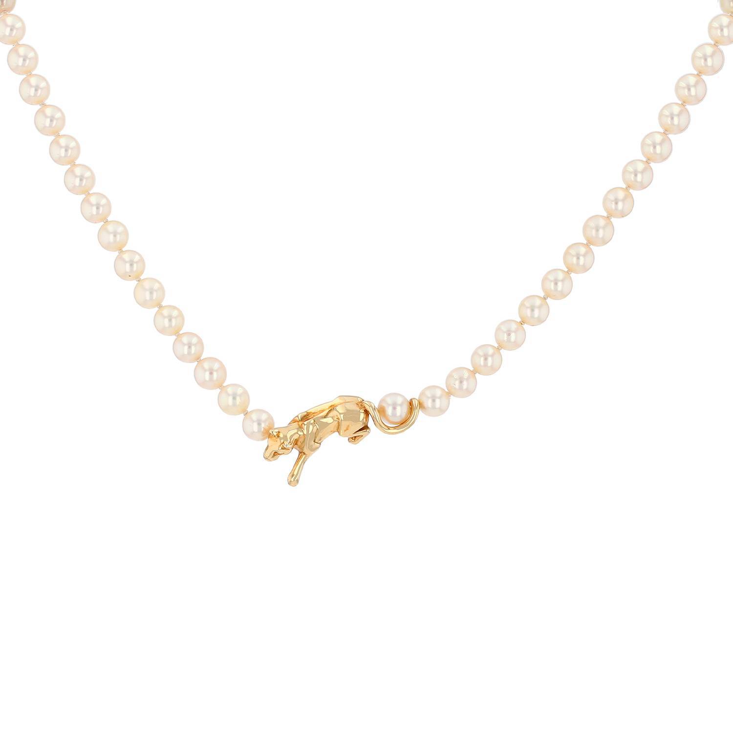 Cartier necklace in yellow gold and cultured pearls, composed of of a series of pearls, decorated with one panther in yellow gold.