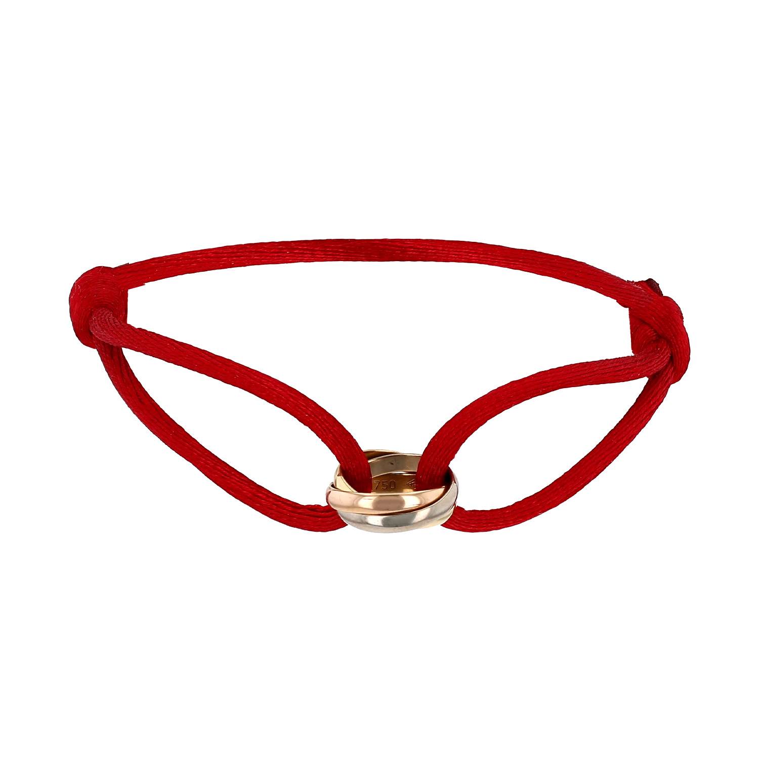 Cartier Trinity bracelet in 3 golds, composed of of a series of elegant interwoven rings in yellow gold, in pink gold and in white gold, hold by a red in silk link.