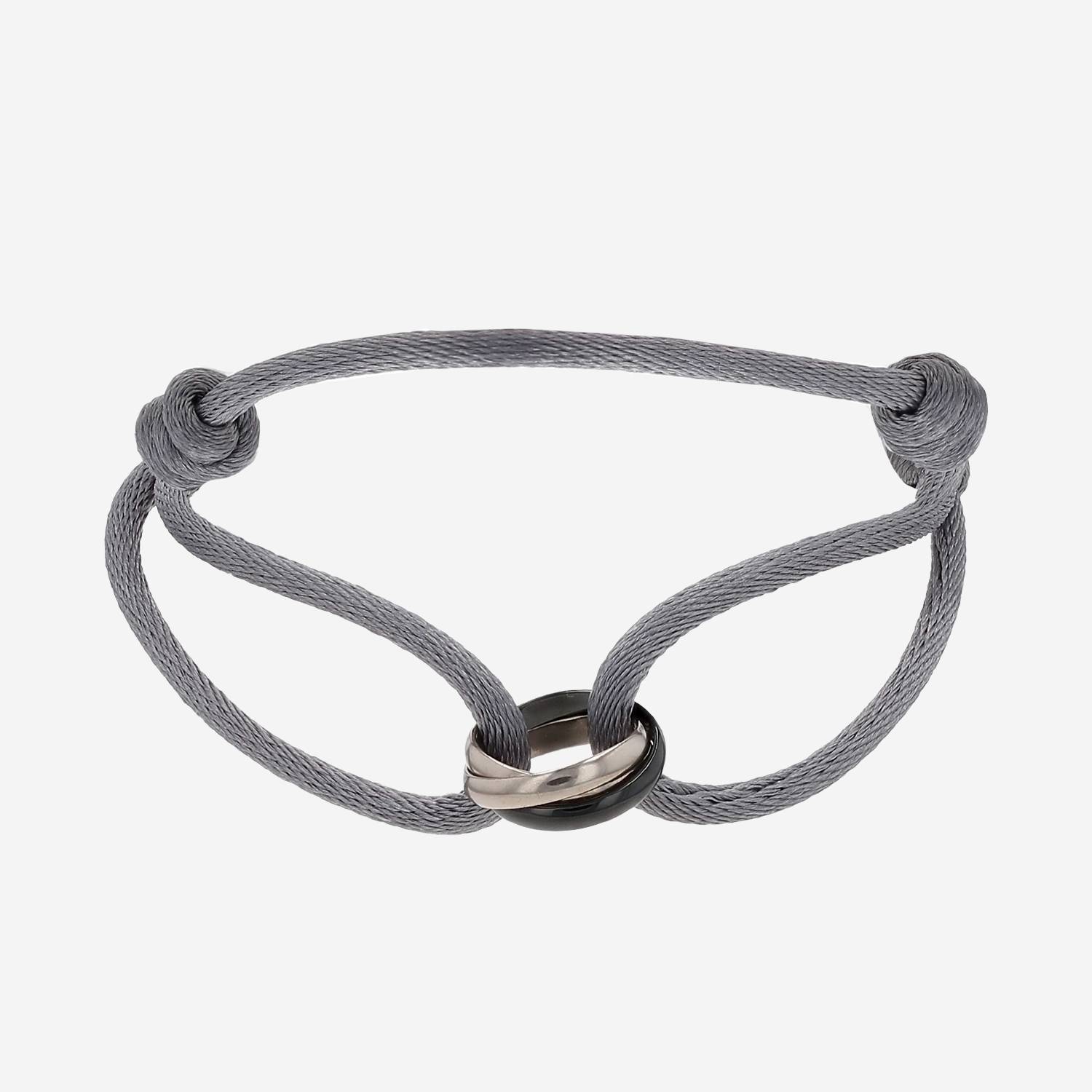 Cartier Trinity bracelet in white gold and ceramic, composed of of a series of elegant interwoven rings in white gold black, in ceramic, hold by a grey link.