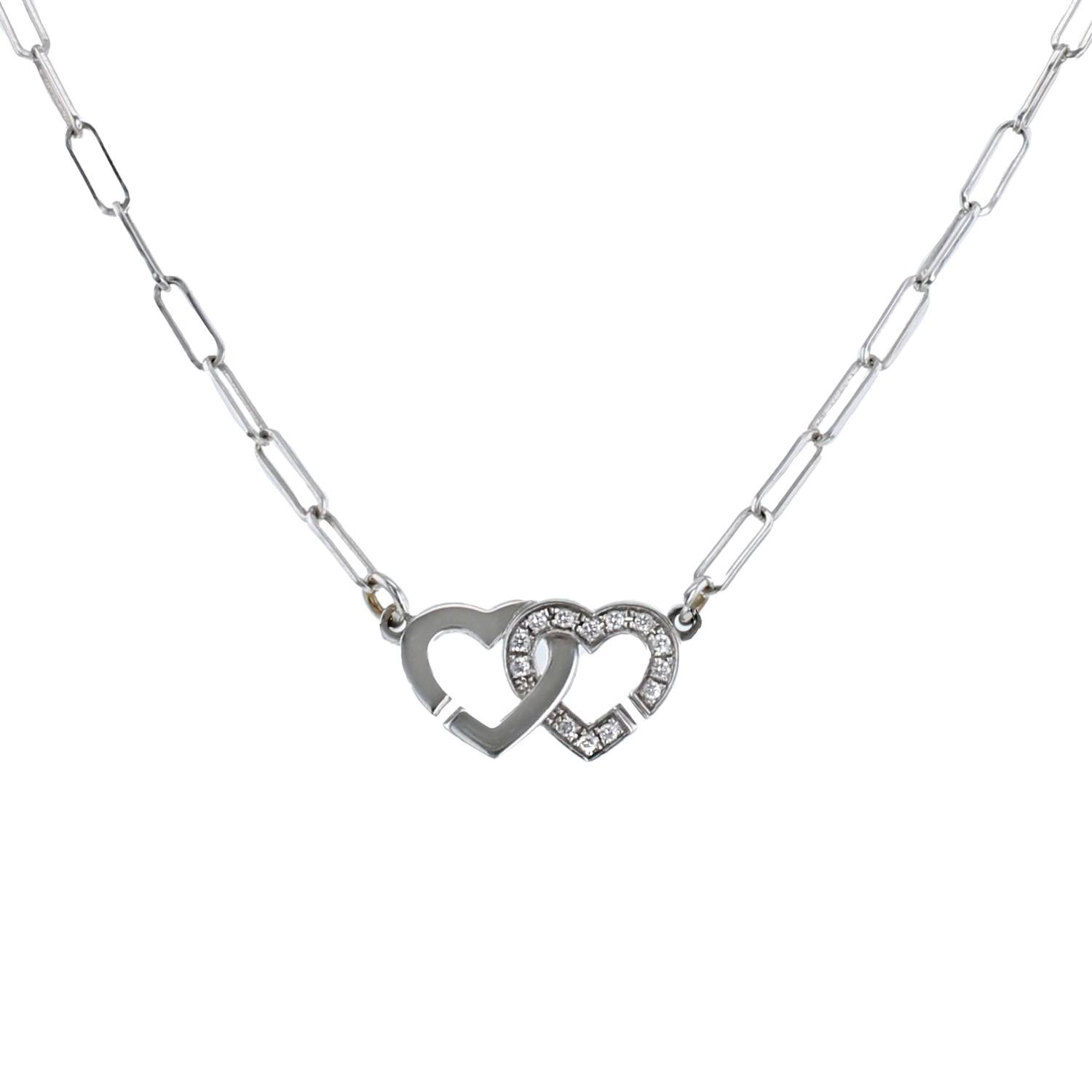 Dinh Van Double coeurs R9 necklace in white gold and diamonds, composed of of lovely wrapped hearts in white gold partially paved with of brilliant cut diamonds about 0.10 carat, enhanced one beautiful chain in white gold.