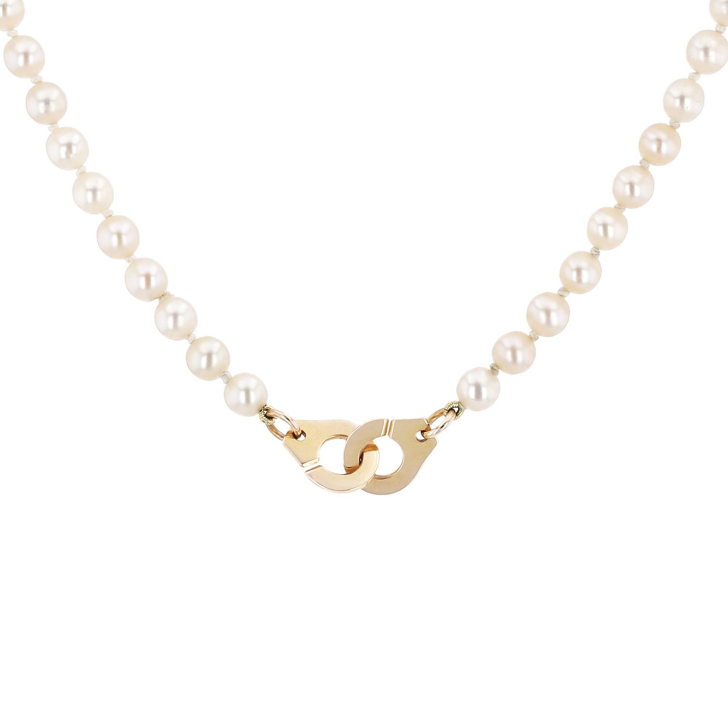 Dinh Van Menottes R10 necklace in pink gold and cultured pearls, composed of one lovely row of cultured pearls, enhanced of the timeless interwoven pair of handcuffs in pink gold.