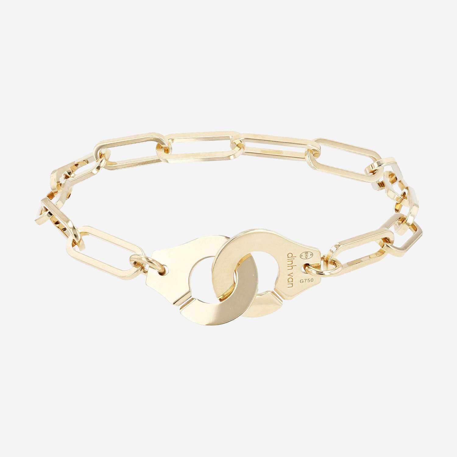 Dinh Van Menottes R15 bracelet in yellow gold, composed of one interwoven pair of handcuffs, enhanced one chain in yellow gold.