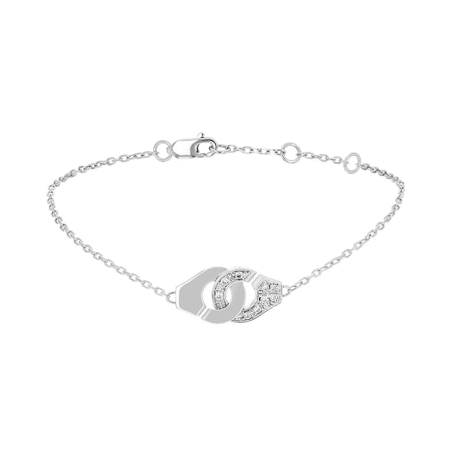 Charming Dinh Van Menottes R8 bracelet in white gold and diamonds, including one delicate interwoven pair of handcuffs partially paved with of brilliant cut diamonds, hold by one in white gold chain.