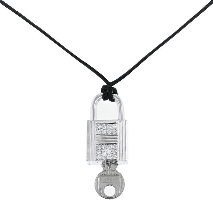 Hermès Kelly pendant in white gold and diamonds, composed of one padlock in white gold delicately set with of brilliant cut diamonds.