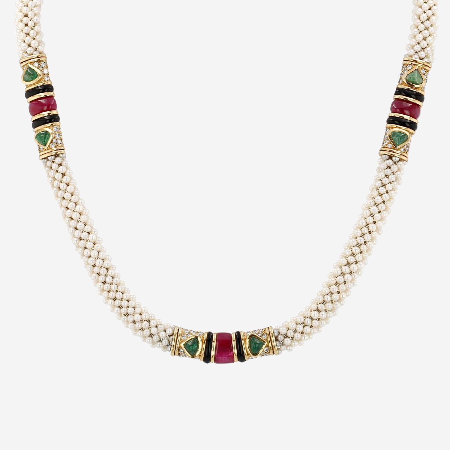 Marina B 1980's necklace in yellow gold, cultured pearls, onyx, rubies, emeralds and diamonds Collector Square Referenz: 42 95 32