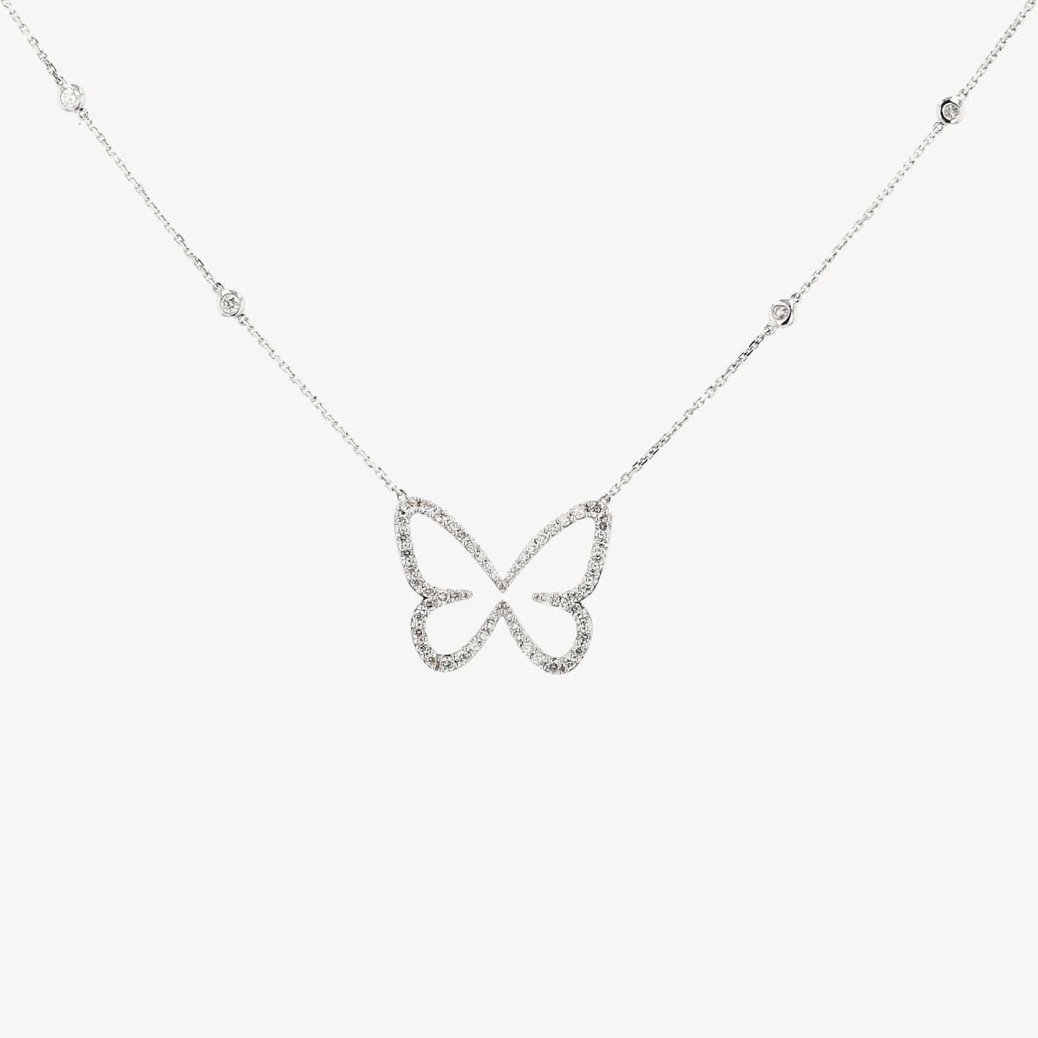 Messika Butterfly large model necklace in white gold and diamonds, including a lovely hemstitched butterfly in white gold carefully set with a total of 0.57 carat of brilliant cut diamonds, hold by one thin white gold forcat chain enhanced with 4 diamonds close set.