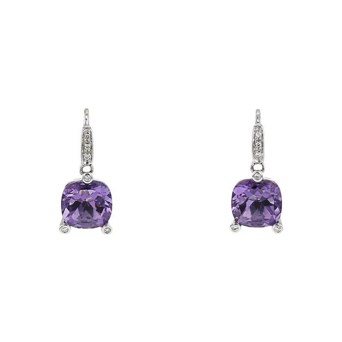 Elegant Poiray Fille Antique earrings in white gold diamonds, and in amethysts, composed of 2 superb faceted amethyst cushion cut about 7 carats, decorated with one delicate line of diamonds brilliant cut weighting a total of 0.10 carat on the top, enhanced with 3 small claw sets close set of 3 brilliant cut diamonds.