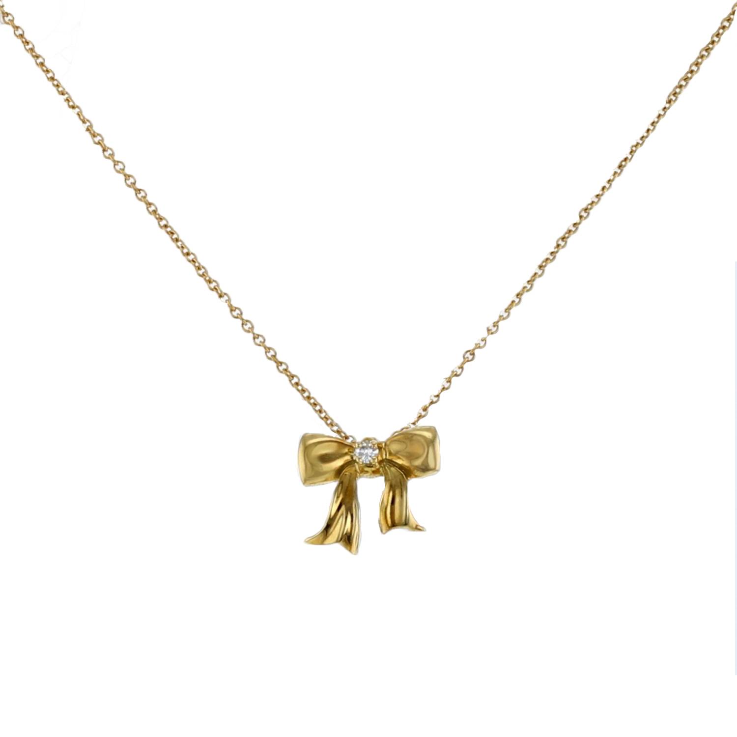 Tiffany & Co necklace in yellow gold and diamond, including a bow in yellow gold elegantly set with one brilliant cut diamond about 0.02 carat, hold by one thin in yellow gold chain.