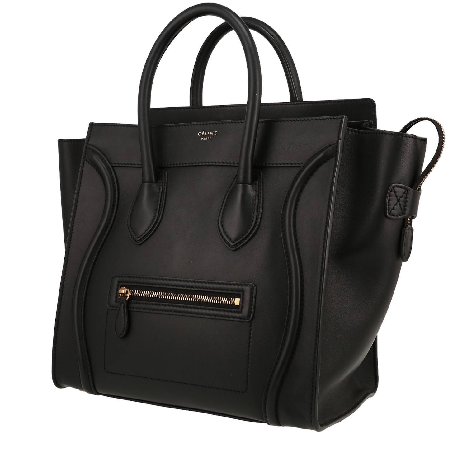 Celine Luggage Mini handbag in black smooth leather, hardware in gilt metal, double handle in black leather allowing the bag to be worn in the hand.