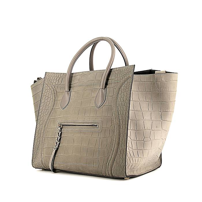 Famous Celine Phantom handbag in grey leather imitating crocodile, hardware in gilt metal, double handle in grey leather allowing the bag to be worn in the hand.