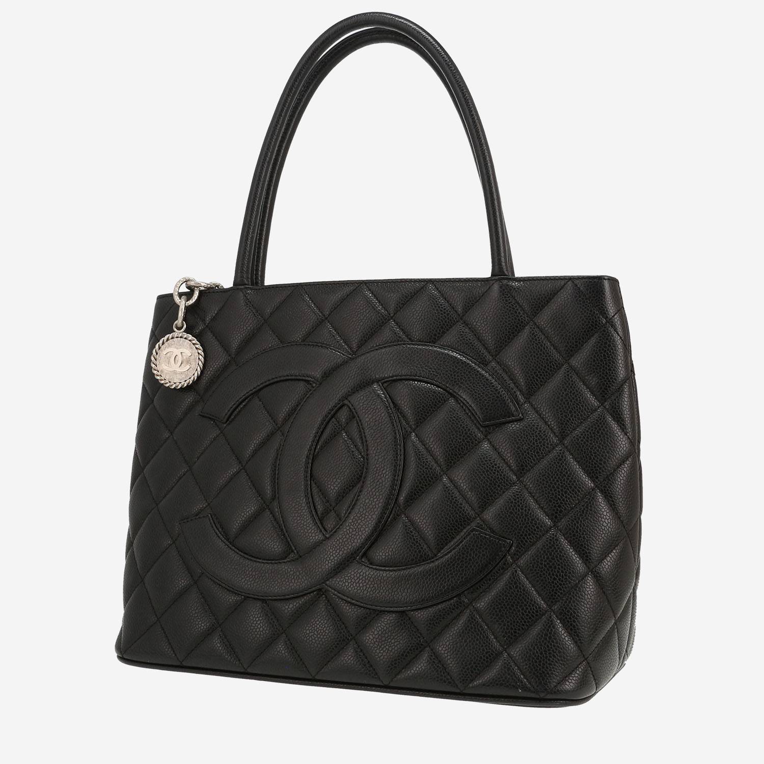 Classic Chanel Medaillon handbag in black leather, hardware in silver metal, double handle in black leather allowing the bag to be worn in the hand or on the shoulder.