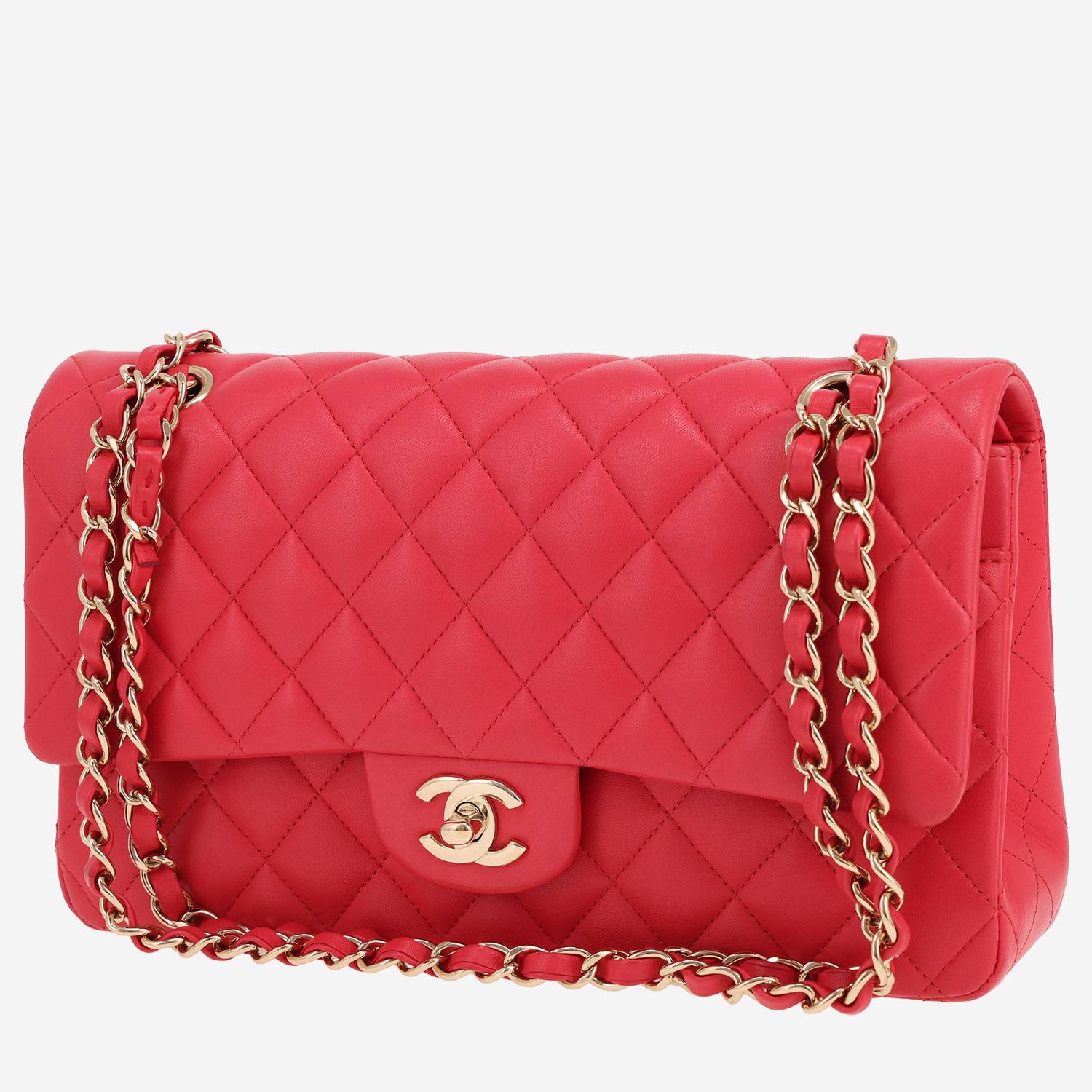 Wonderful Chanel Timeless Classic handbag in red quilted leather, hardware in gilt metal, one convertible chain strap in gilt metal interwoven with red leather allowing the bag to be worn in the hand or on the shoulder.