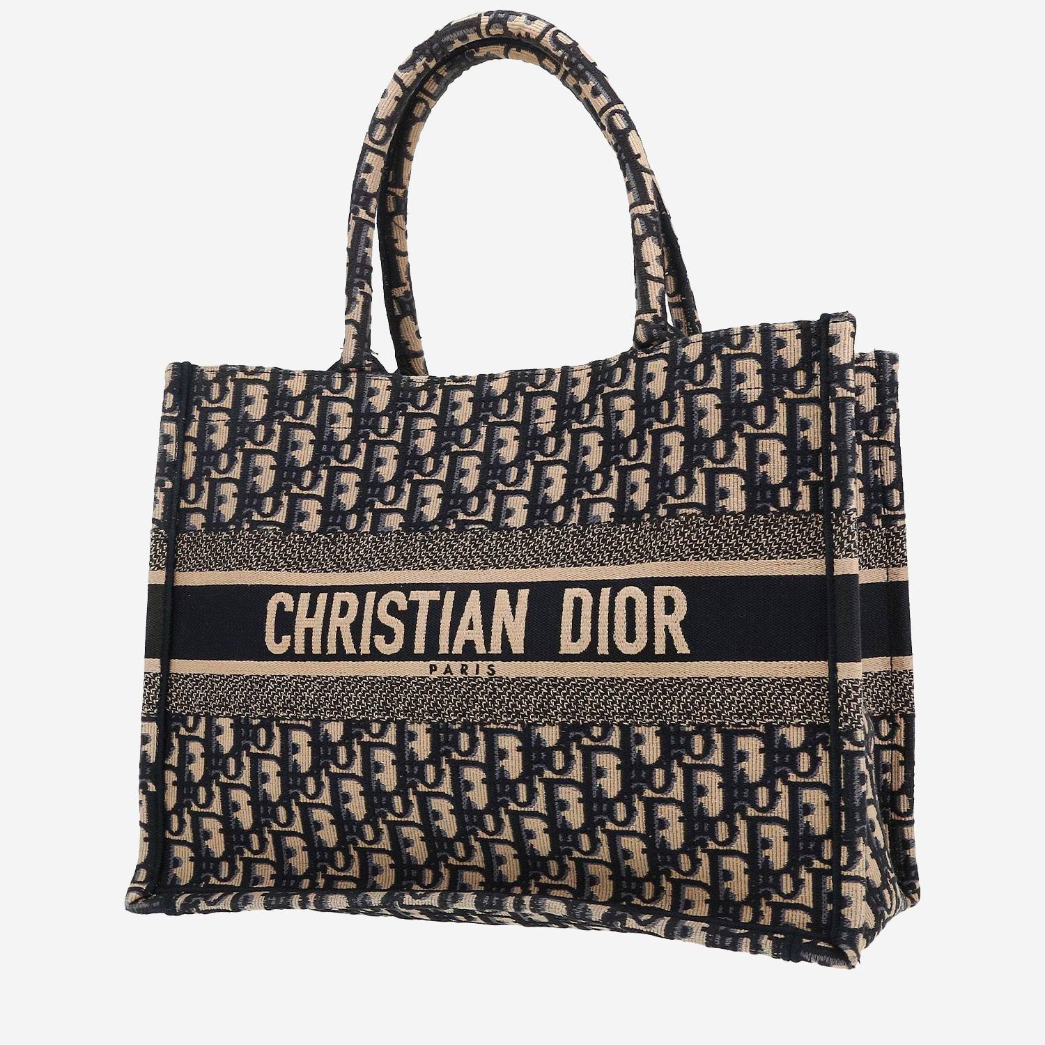 Elegant medium model Dior Book Tote shopping bag in blue and beige monogram canvas Oblique, double handle in blue monogram canvas Oblique allowing the bag to be worn in the hand.