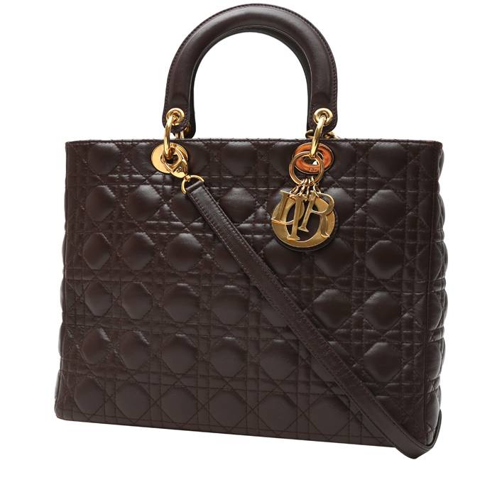 Dior Lady Dior handbag in brown leather cannage, hardware in gilt metal, double handle in black leather, brown leather removable strap to be worn accross the body allowing the bag to be worn in the hand or on the shoulder.