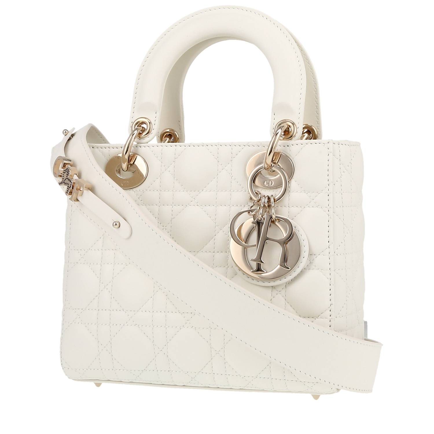 Timeless Lady Dior handbag in white leather cannage, hardware in silver metal, double handle in white leather, one shoulder strap in white leather allowing the bag to be worn in the hand or on the shoulder or accross the body.