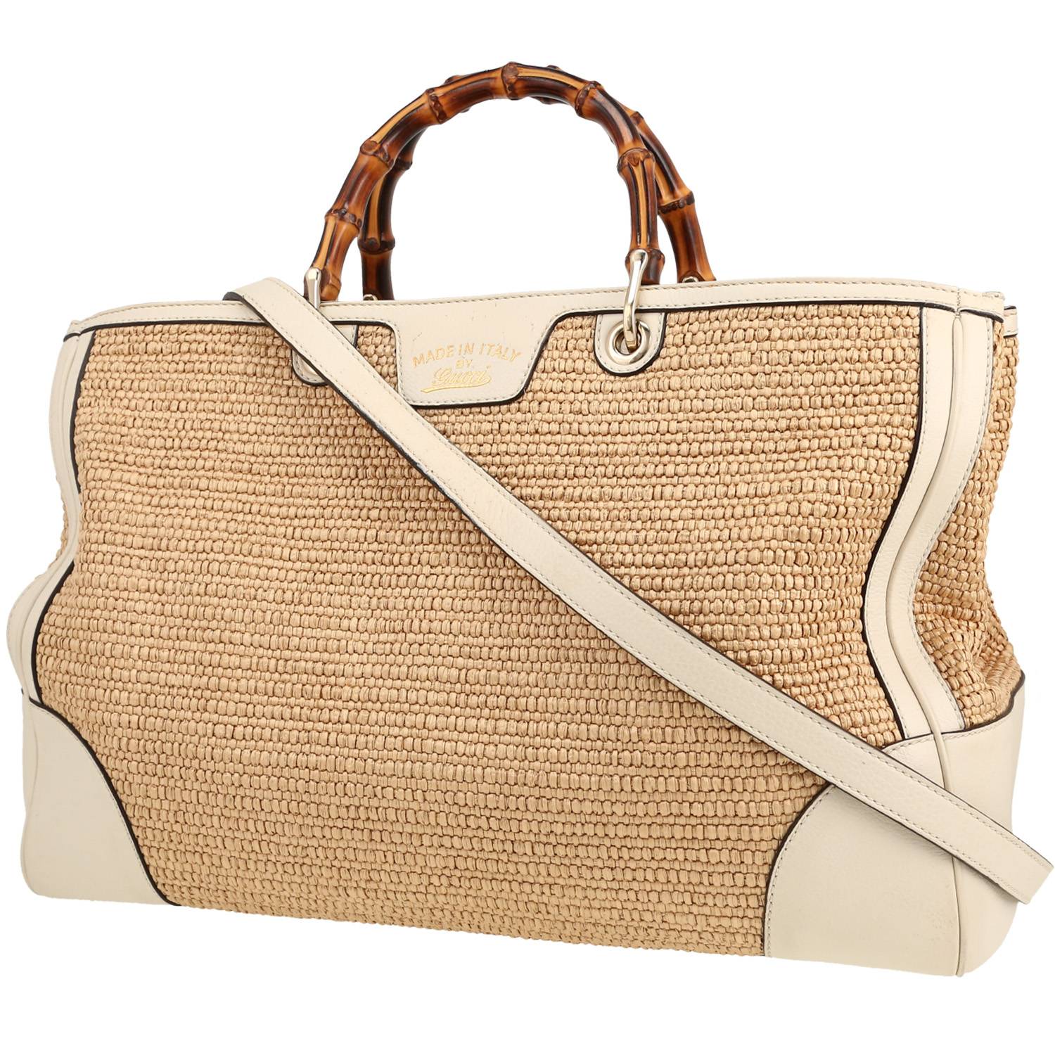 Charming Gucci handbag raphia, double handle bamboo, one removable shoulder strap in white leather allowing the bag to be worn in the hand or on the shoulder or accross the body.