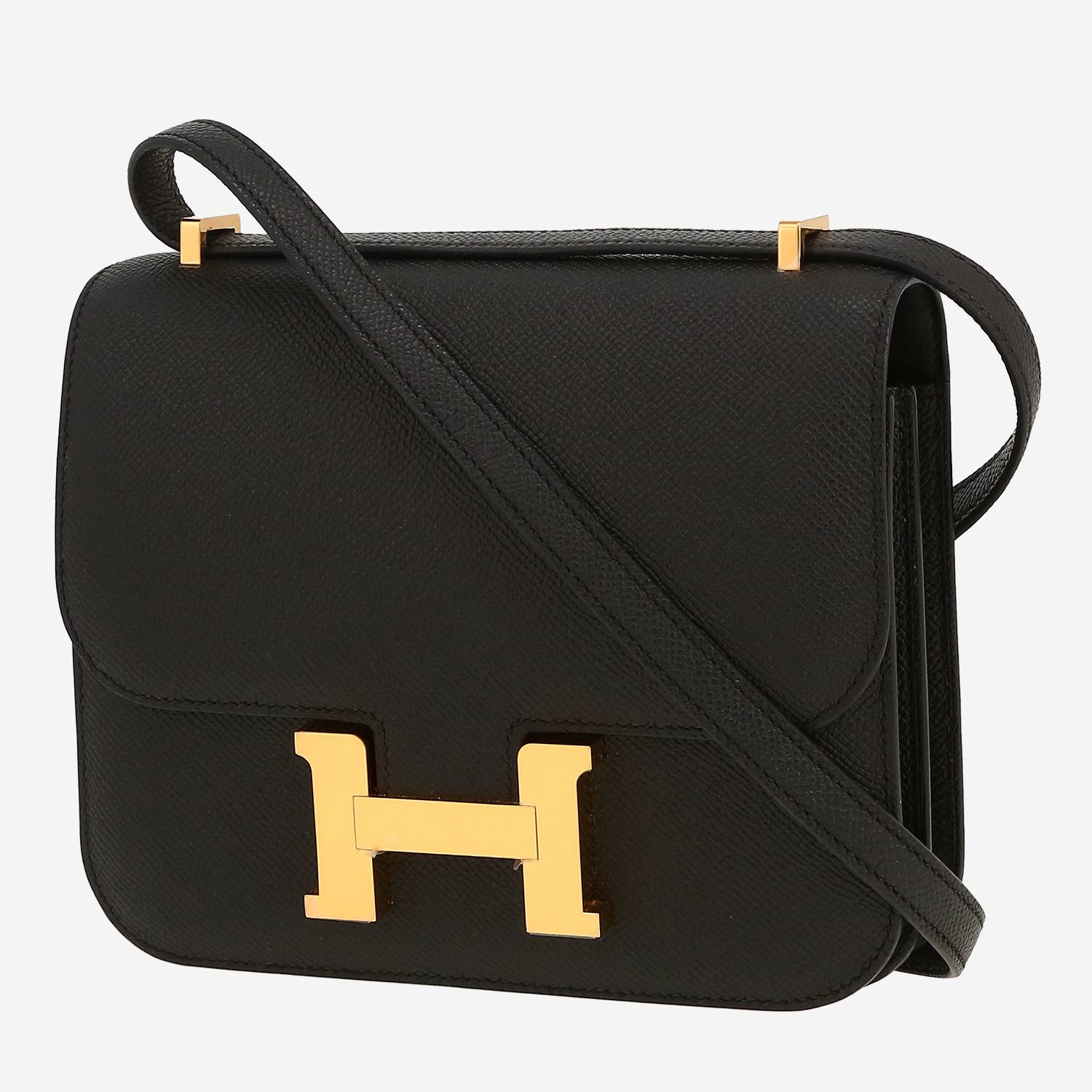 Elegant mini Hermès Constance shoulder bag in black epsom leather, hardware in gilt metal, double convertible strap in black leather allowing the bag to be worn in the hand or on the shoulder or accross the body.