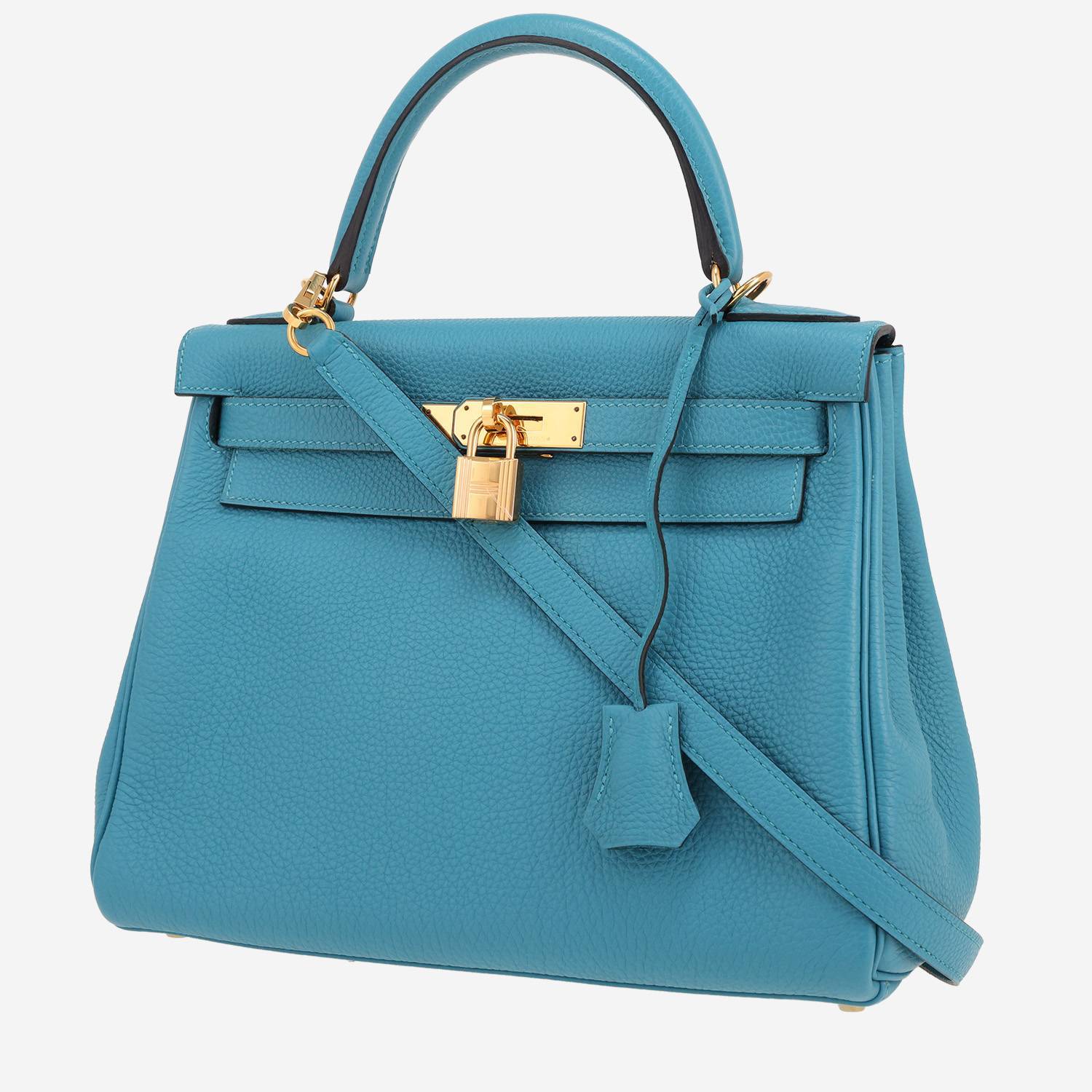 Wonderful Hermès Kelly 28 cm handbag in blue jean togo leather, hardware in gilt metal, simple handle in blue jean leather, blue jean leather removable strap to be worn accross the body allowing the bag to be worn in the hand or on the shoulder.