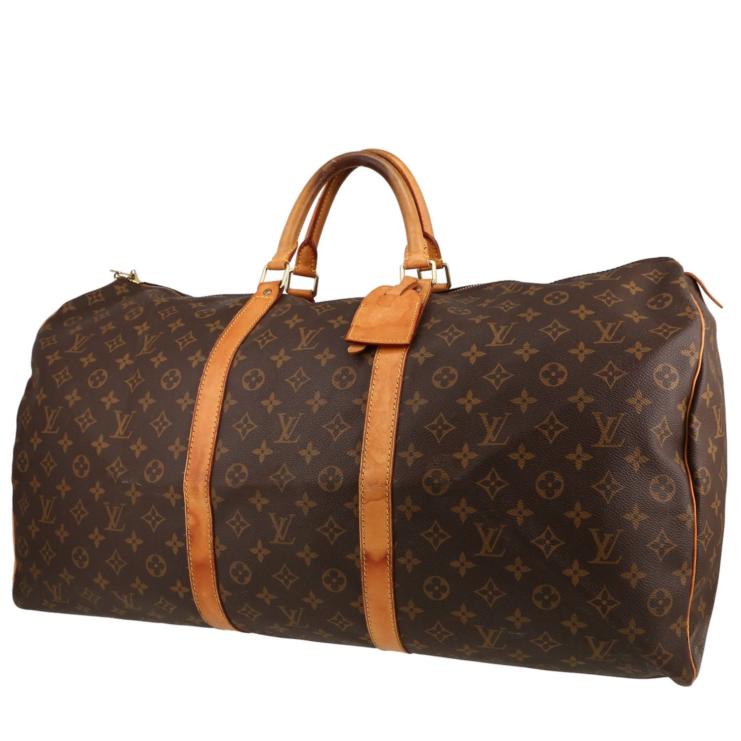 Timeless Louis Vuitton Keepall 60 travel bag in brown monogram canvas, hardware in gilt metal, double handle natural leather allowing the bag to be worn in the hand.