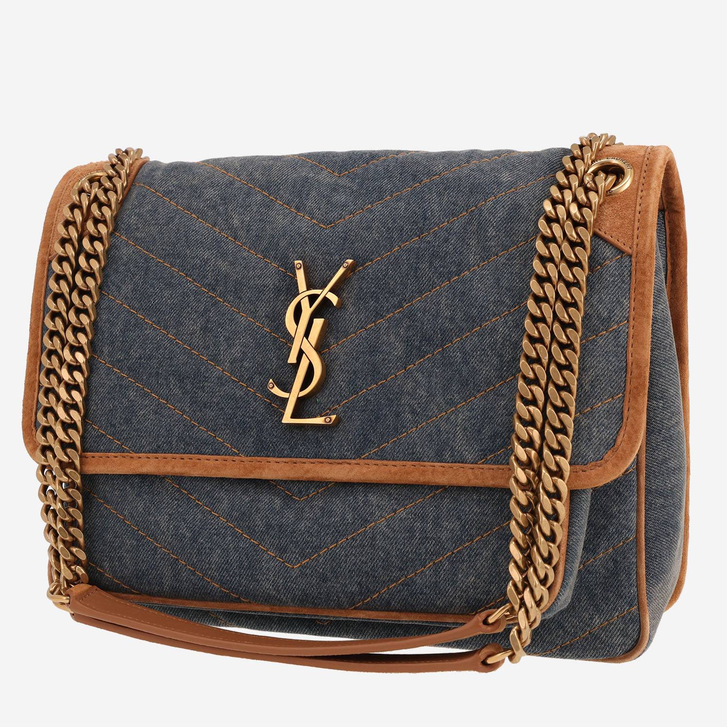 Wonderful Saint Laurent Niki shoulder bag in blue denim canvas, hardware in gilt metal, double convertible chain strap in gilt metal allowing the bag to be worn on the shoulder or accross the body.
