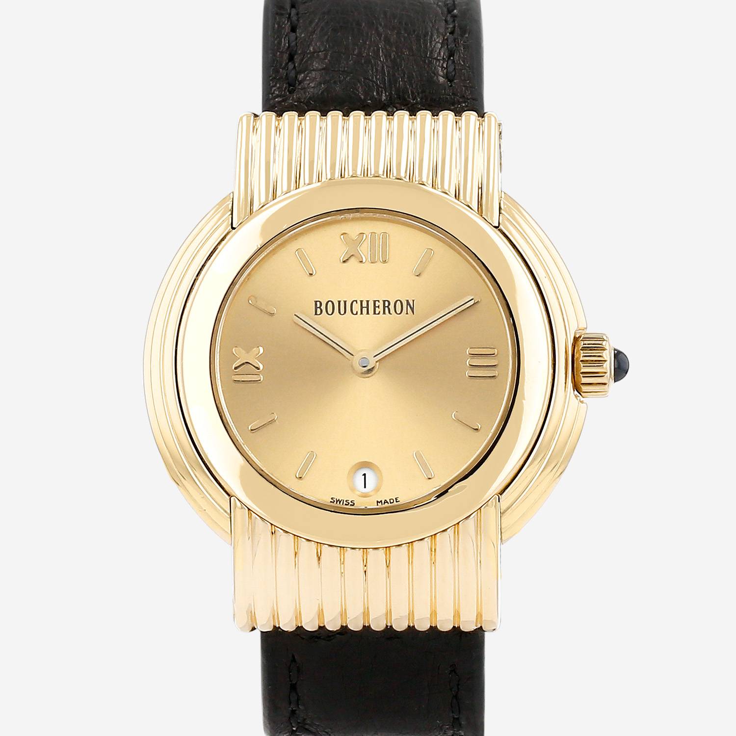 Yellow gold Boucheron Reflet wristwatch. Round case in yellow gold with godron, screwed caseback, canned crown set with a sapphire cabochon.