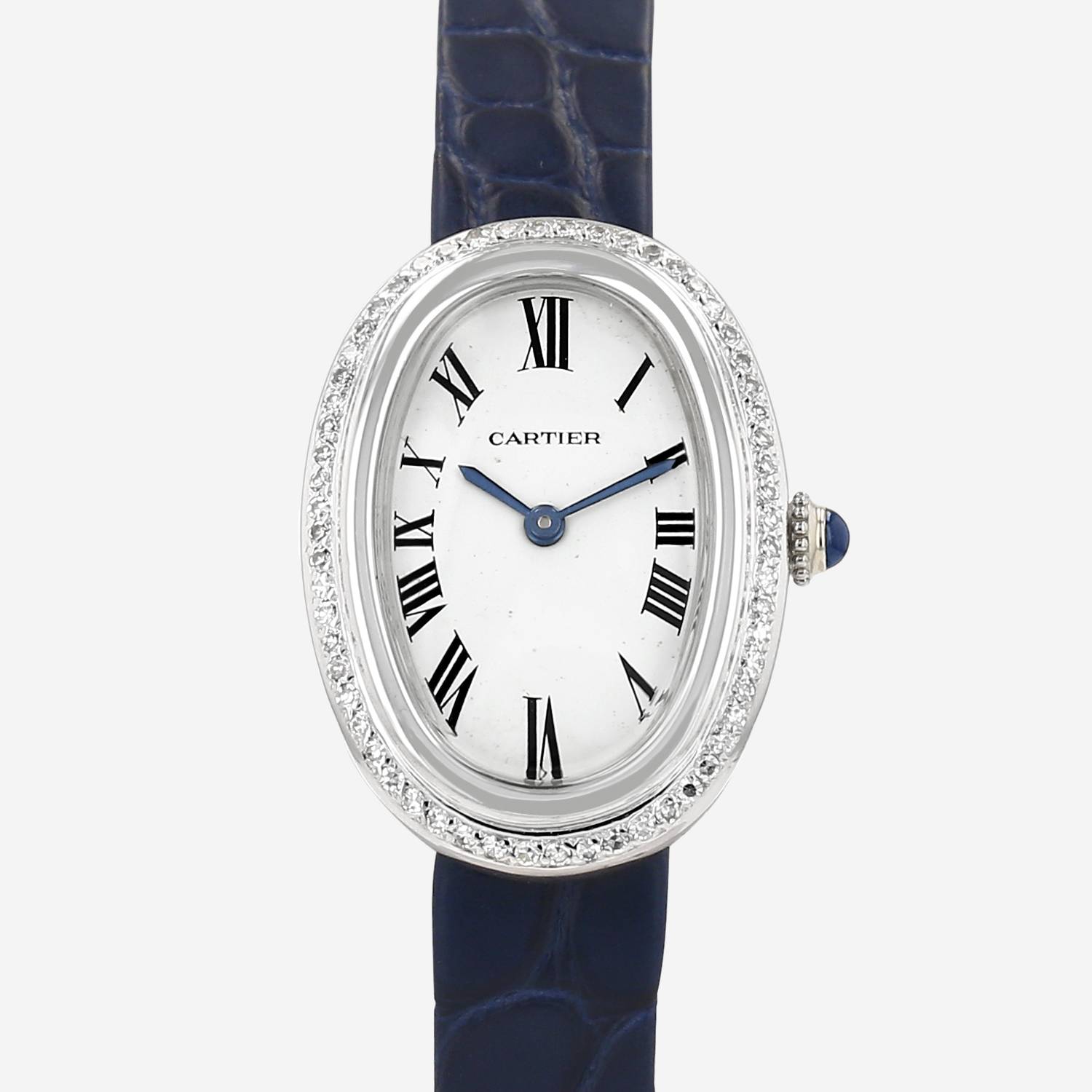 White gold Cartier Baignoire wristwatch. Oval case in white gold with diamonds, screwed caseback, canned crown set with a sapphire cabochon.