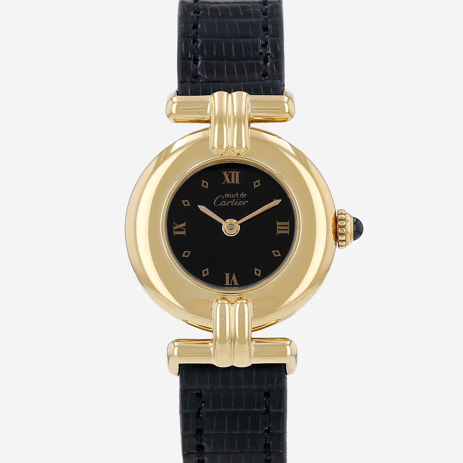 Vermeil Cartier Must Colisée wristwatch. Round case in vermeil, screwed caseback, canned crown set with a sapphire cabochon.