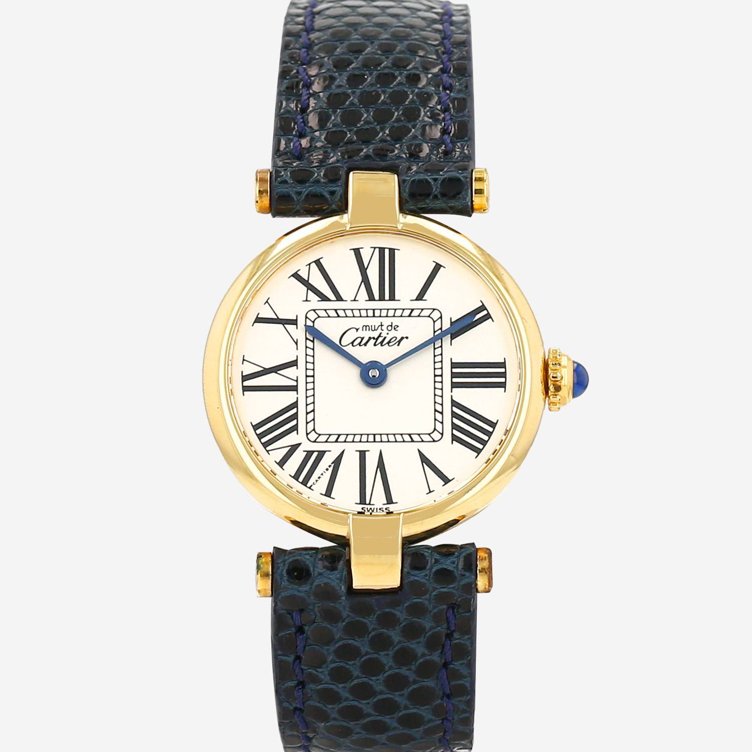 Vermeil Cartier Must Vendôme wristwatch. Round case in vermeil, screwed caseback, canned crown set with a sapphire cabochon.