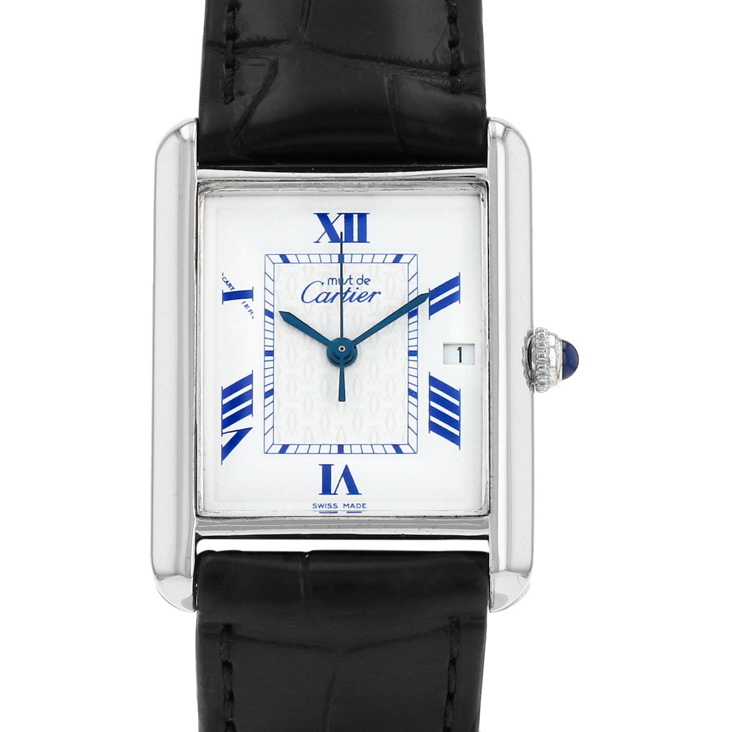 Silver Cartier Tank Must wristwatch. Rectangular case in silver, screwed caseback, crown set with a sapphire cabochon.