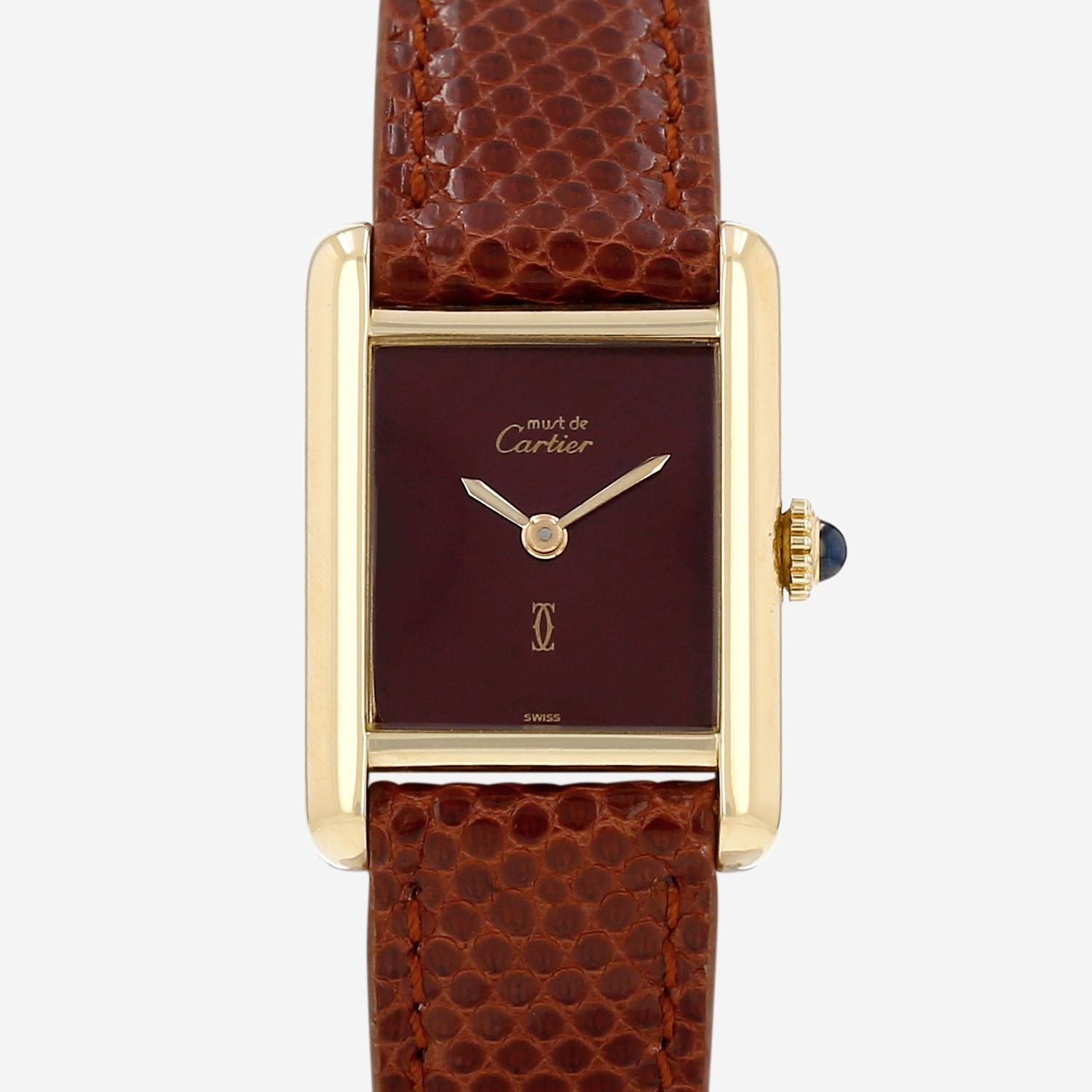 Vermeil Cartier Tank Must wristwatch. Rectangular case in vermeil, screwed caseback, canned crown set with a sapphire cabochon.