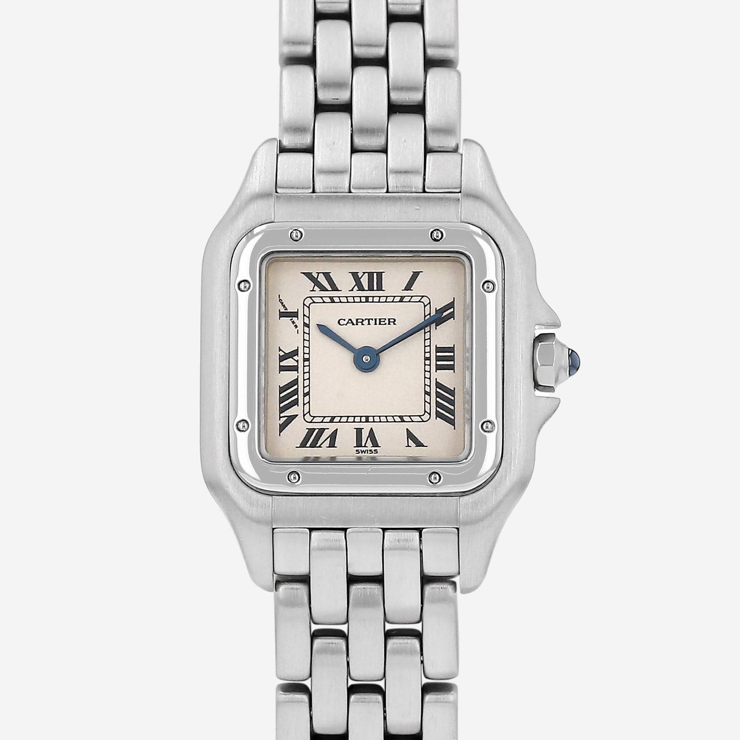 Stainless steel Cartier Panthère wristwatch. Square case in stainless steel, screwed caseback, screwed bezel, crown set with a sapphire cabochon.