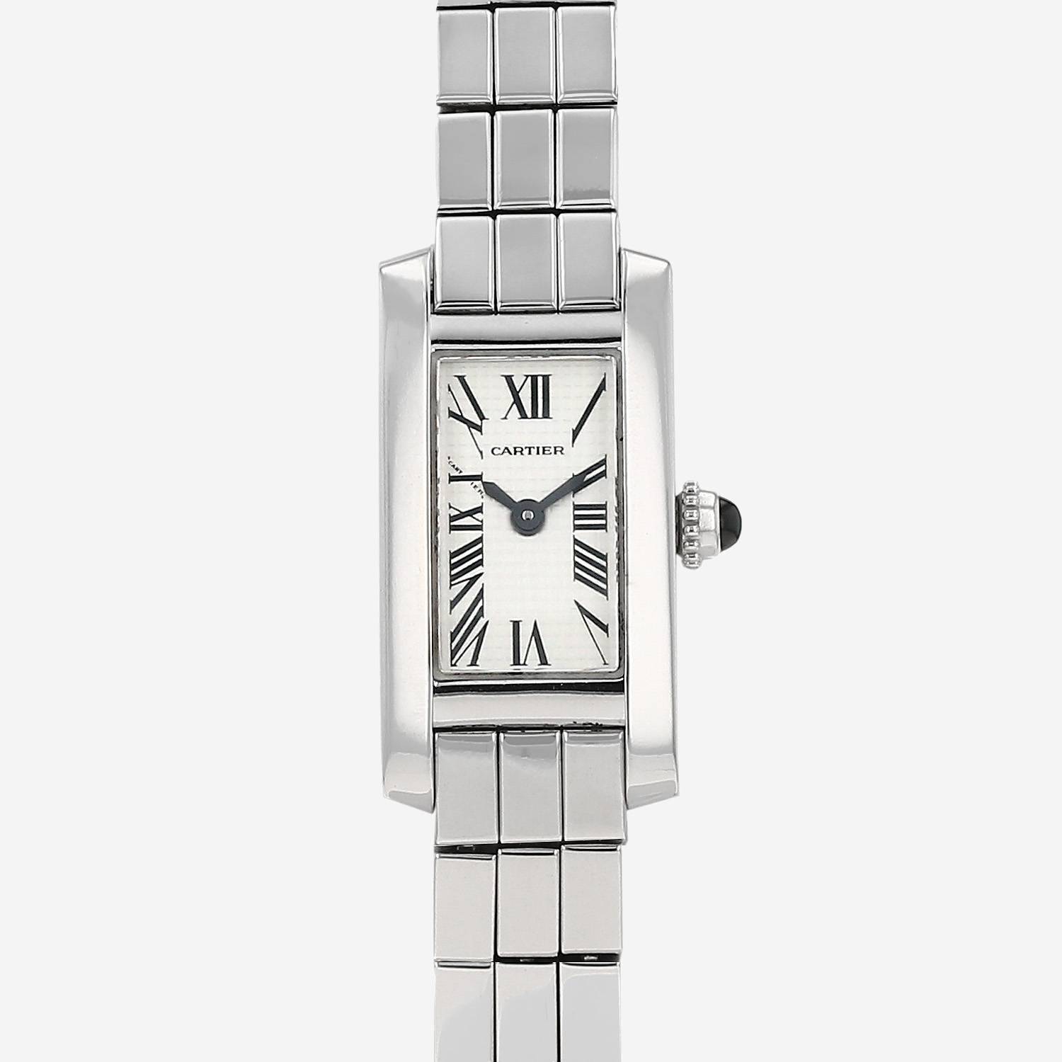 White gold Cartier Tank Américaine wristwatch mini. Rectangular case in white gold, screwed caseback, canned crown set with a sapphire cabochon and blue.