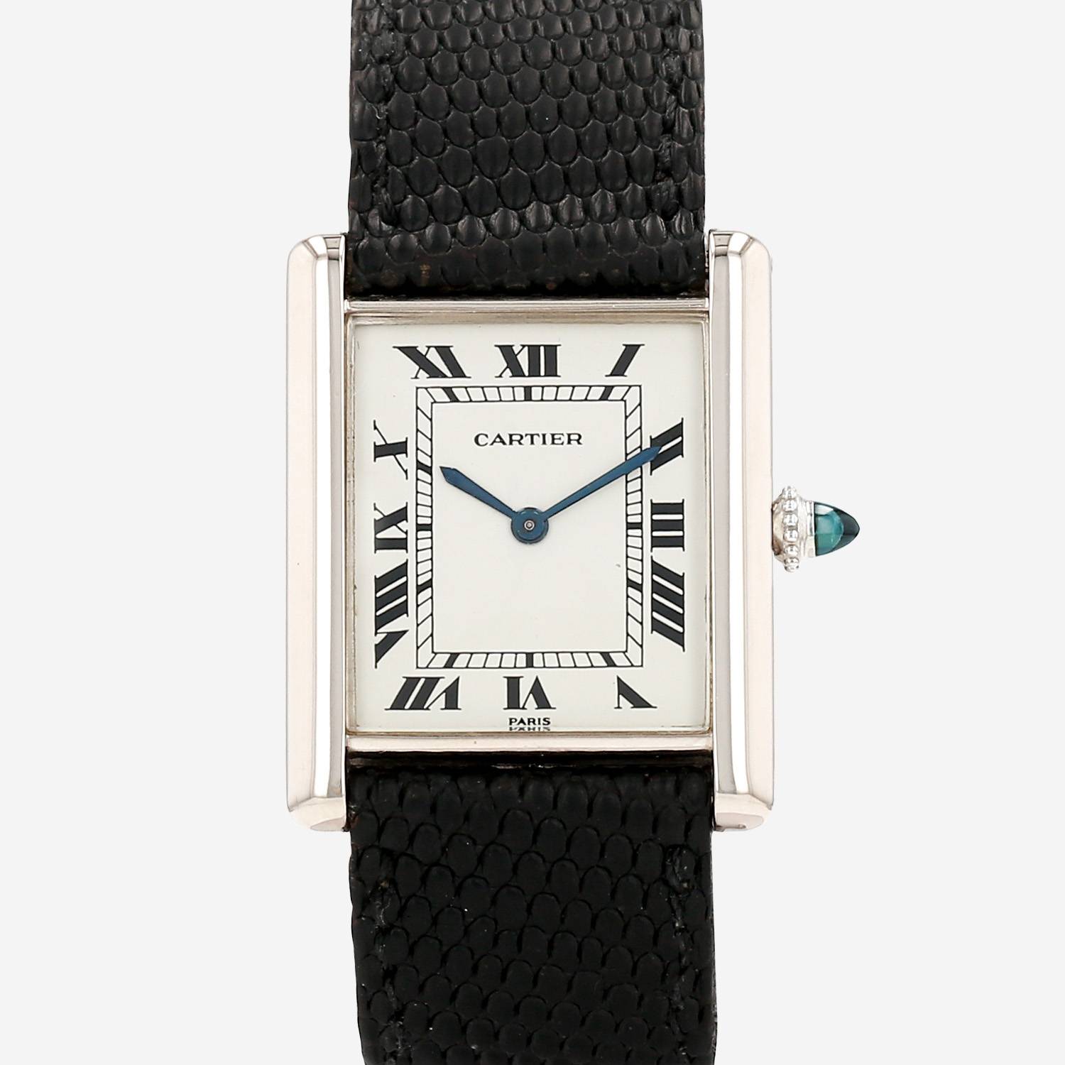 White gold Cartier Tank Louis Cartier wristwatch small model. Rectangular case in white gold, screwed caseback, canned crown set with a sapphire cabochon.