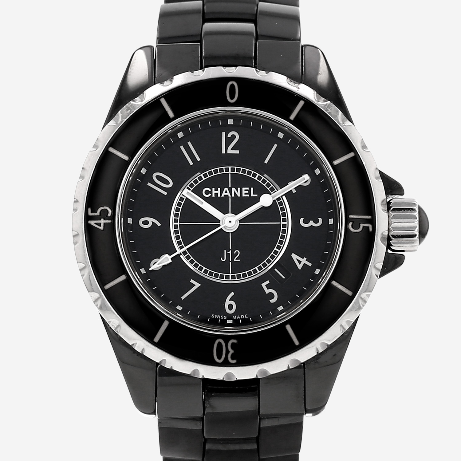 Ceramic and stainless steel Chanel J12 wristwatch. Round case in ceramic, screwed caseback, directional graduating rotating bezel, screw-down crown.