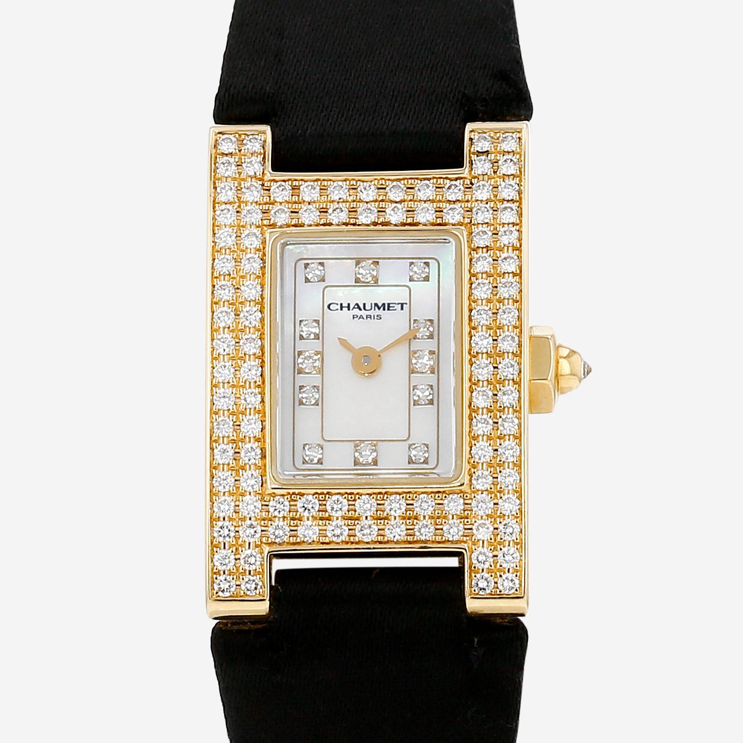 Yellow gold Chaumet Style wristwatch. H case in yellow gold with diamonds, screwed caseback, crown set with a diamond cabochon.