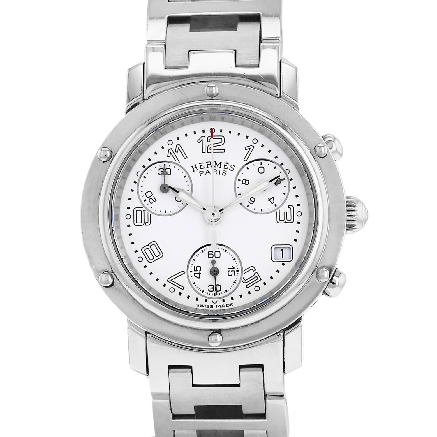 Stainless steel Hermès Clipper Chrono wristwatch. Round case in stainless steel, clipped caseback, round pushers, at 2 o'clock and 4 o'clock, canned crown.