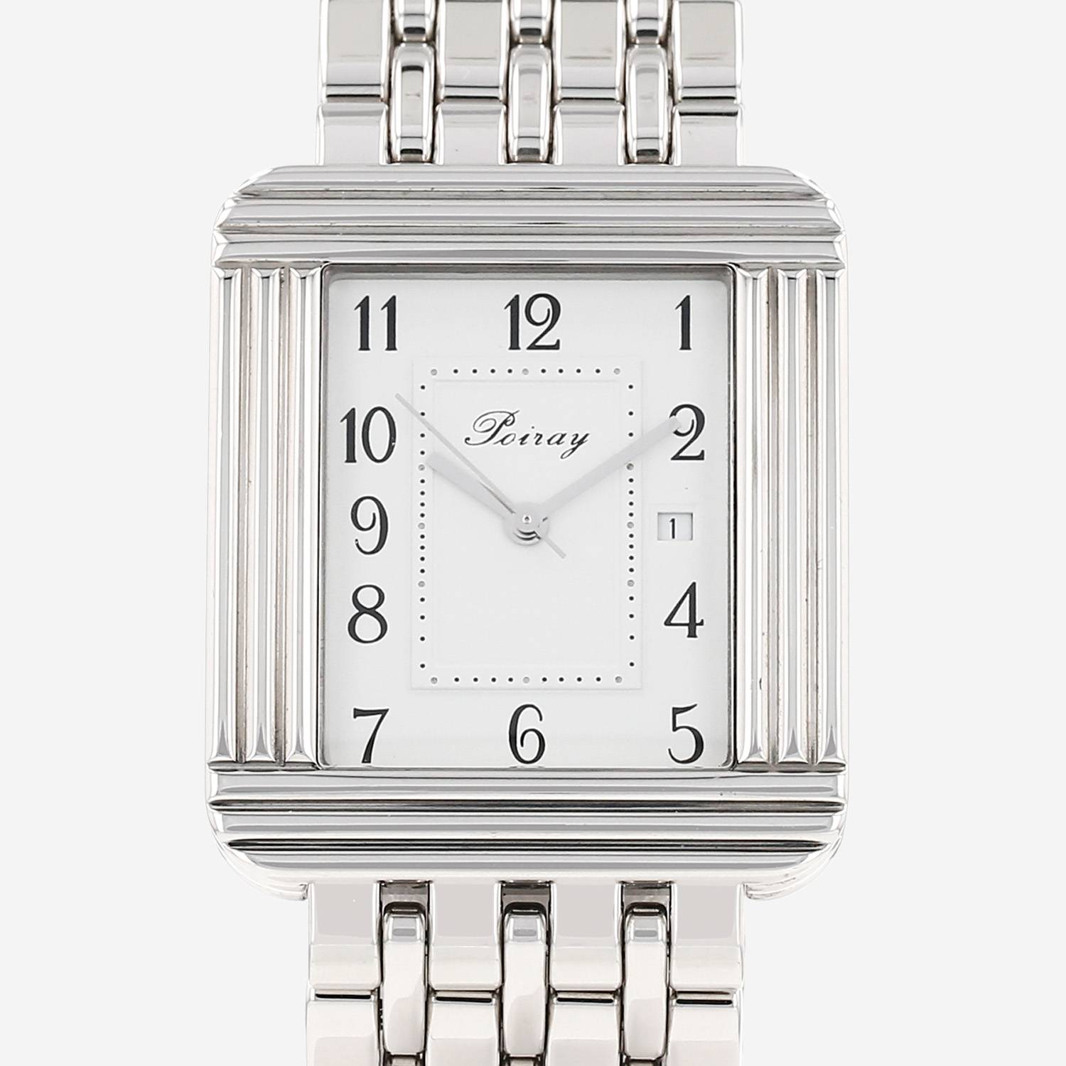 Stainless steel Poiray Ma Première wristwatch. Square case in stainless steel with triple godron, screwed caseback, canned crown integrated to the case.