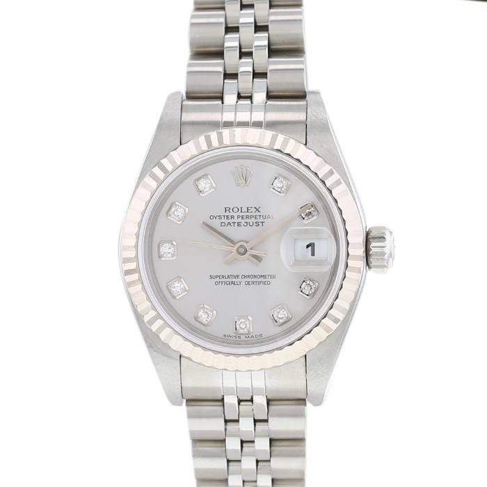 Gold and stainless steel Rolex Datejust Lady wristwatch. Round case in stainless steel, screwed caseback, white gold striated bezel, screw-down crown.