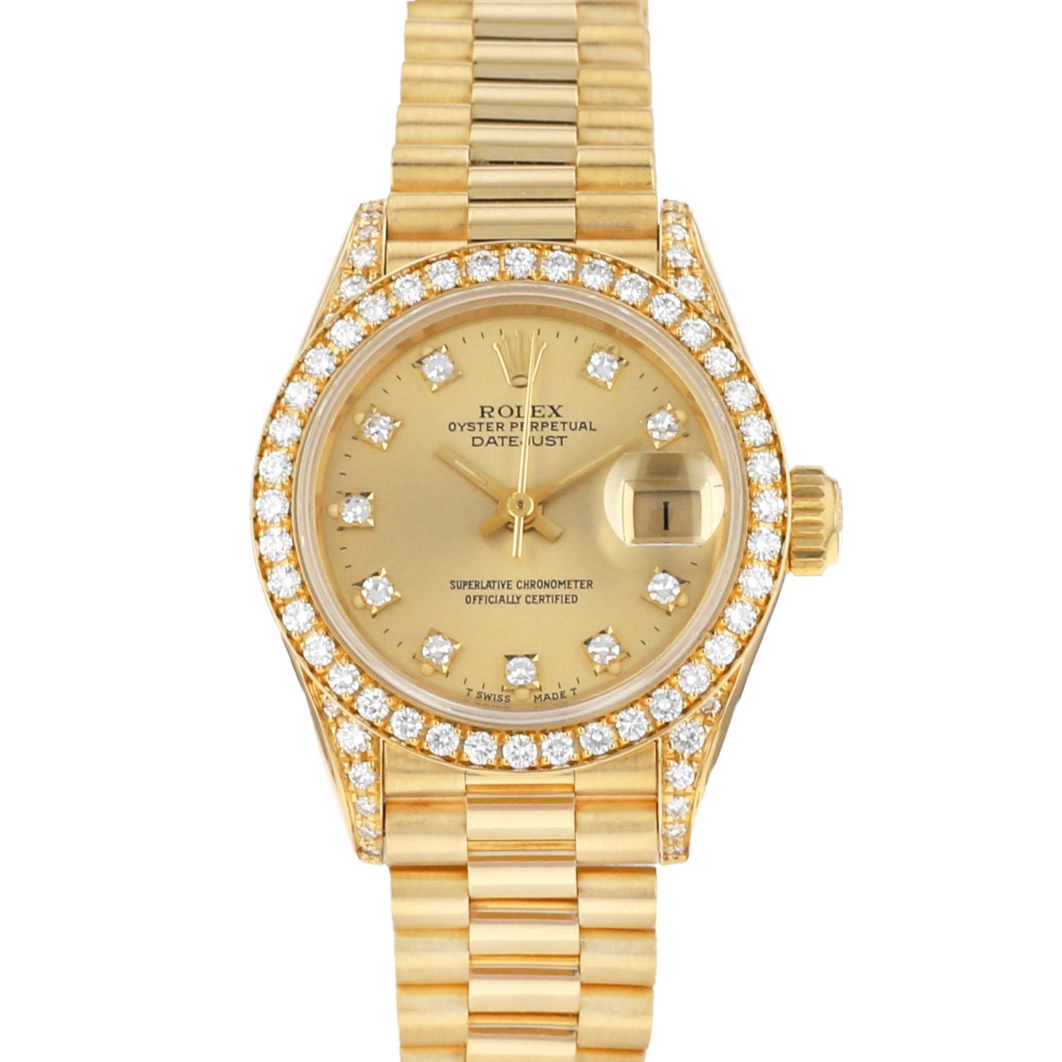 Yellow gold Rolex Datejust Lady wristwatch. Round case in yellow gold with diamonds, screwed caseback, yellow gold bezel with diamonds, canned crown.